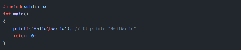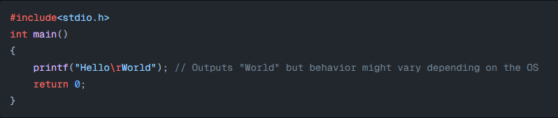 The carriage return, represented by the escape sequence \r in the C programming language, is a control character that resets the cursor position to the beginning of the current line. It doesn’t erase any characters but simply moves the cursor to the start of the line. The string “Hello” is printed first, then the carriage return moves the cursor back to the beginning of the line, and “World” is printed, overwriting “Hello.”