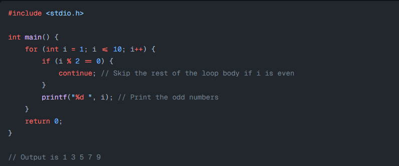 continue keyword skips the rest of the current iteration of the loop and returns to the starting point of the loop